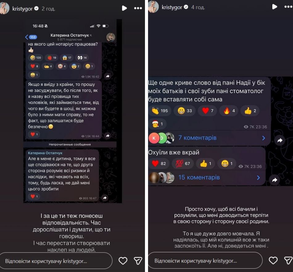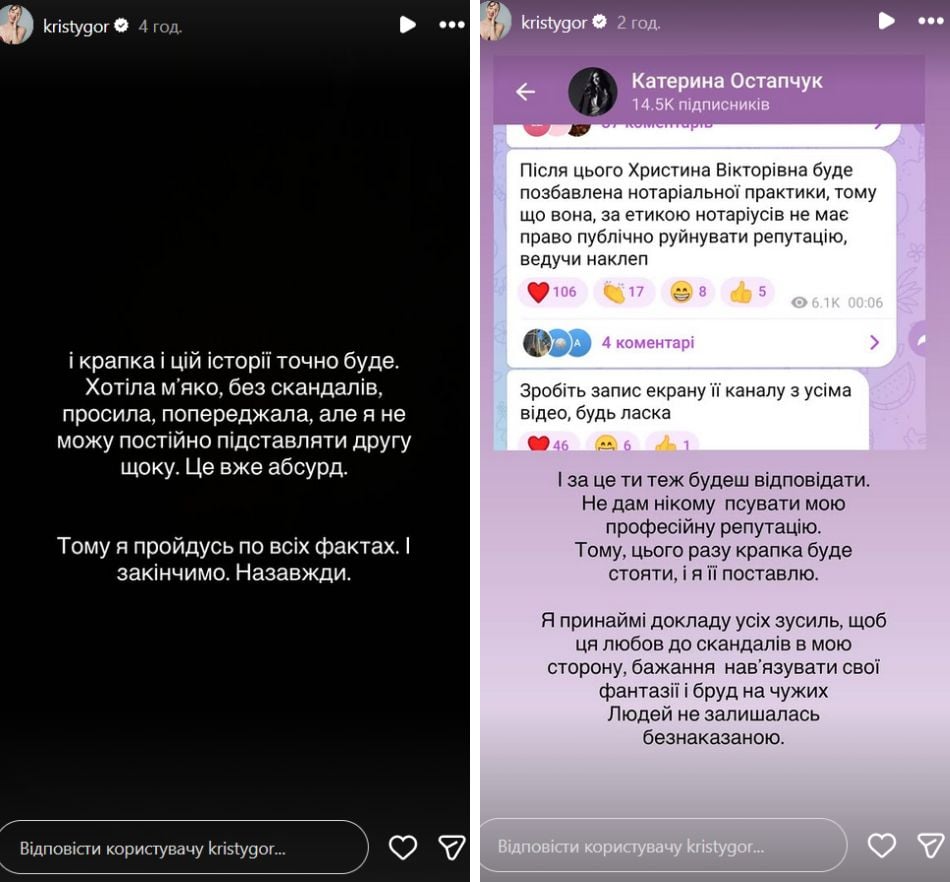 В "сторіз" Христина опублікувала скріншоти з Telegram-каналу Катерини і заявила, що притягне її до відповідальності за поширення наклепів. Нотаріус пообіцяла, що невдовзі поставить крапку в цій історії.