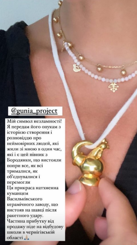 "Мій символ незламності! Я передам його онукам з історією створення і розповіддю про неймовірних людей, які жили зі мною в один час, які і є цей півник з Бородянки, що вистояли попри все, які трималися і об'єднувалися, які перемогли. Ця прикраса натхненна куманцем Васильківського керамічного заводу, що вистояв після ракетного удару. Частина прибутку від продажу піде на відбудову школи в Чернігівській області", - поділилася подробицями ведуча "Світського життя".