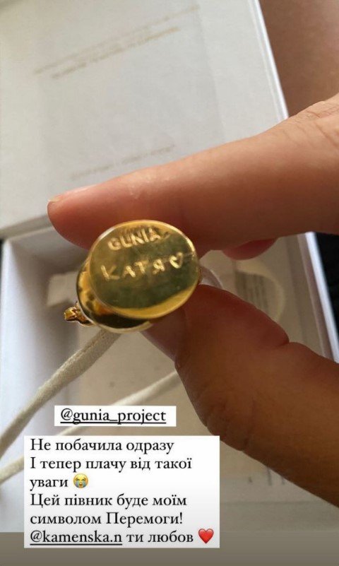 На наступному фото Осадча показала півника з іншого ракурсу, і виявилося, що на ньому викарбуване ім'я "Катя" із сердечком поруч. Зірка подякувала авторці особливого творіння – Наталії Каменській: