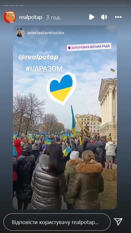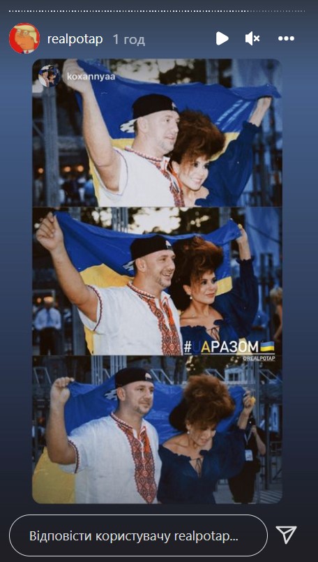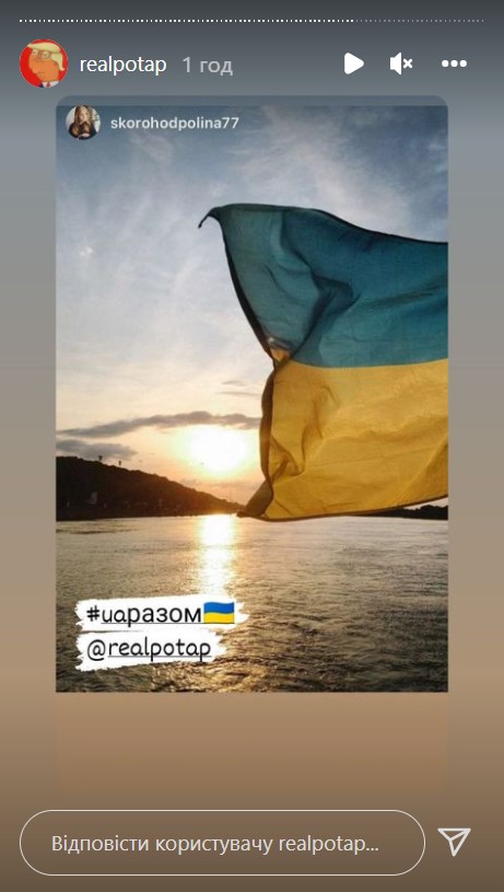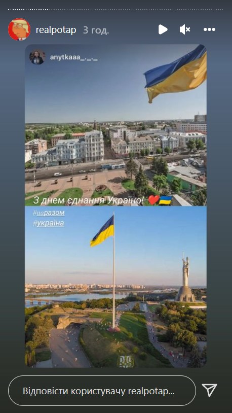На своїй сторінці в Instagram репер також написав, що "на нашу долю випало багато випробувань і нам буде про що розповісти нашим онукам". "У важкі часи нашої історії ми завжди знаходили сили для того, щоб об'єднатися заради нашого майбутнього. Тому і існує такий народ, така нація і така держава! Україна – це люди, які живуть, люблять, працюють та розвивають нашу країну. Це люди, які навіть за кордоном зберігають нашу культуру, традиції та безмежну любов до Богом даної Землі!" - заявив Потап.