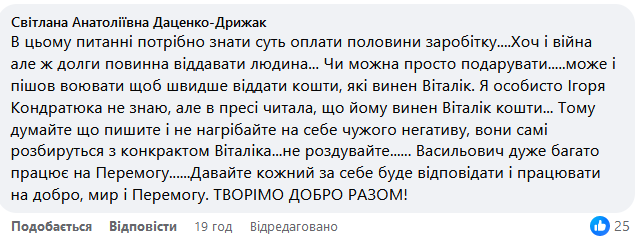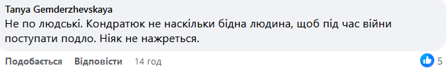 "Навіть війна людей не змінює", "Кондратюк - це вже давно розчарування! Він ганьбить себе з кожним разом все більше і більше. Дуже неприємна особистість", "Щоб йому поперек горла встали ці гроші, ганьба", "Може, і за законом, але точно не по-людськи", "Не по-людськи. Кондратюк не настільки бідна людина, щоб під час війни чинити підло. Ніяк не нажереться", - висловили іншу думку користувачі Facebook
