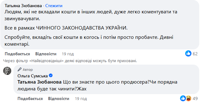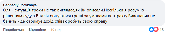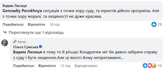 У коментарях Вадим Лисиця додав, що з погляду закону ситуація зрозуміла, але з морального боку – "не дуже красива". Артистка підтримала продюсера. "У тому й то річ, що Кондратюк міг би давно забрати справу з суду і бути людиною. Але ці якості йому не притаманні...", - написала Сумська.