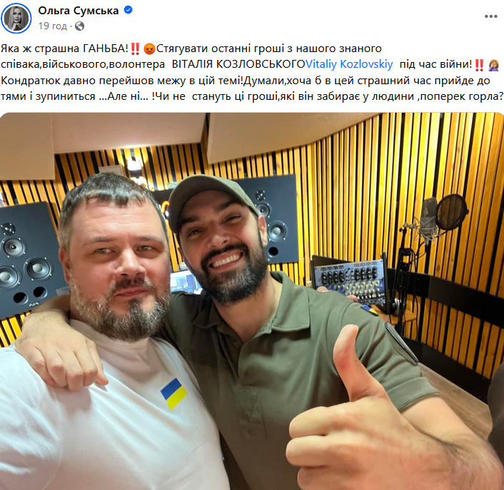 Днями Вадим Лисиця заявив, що Віталій Козловський віддає більшу частину своєї військової зарплатні своєму колишньому наставнику Ігорю Кондратюку. Ольга Сумська назвала "ганьбою" дії продюсера, який стягує борг з воїна Національної Гвардії України.