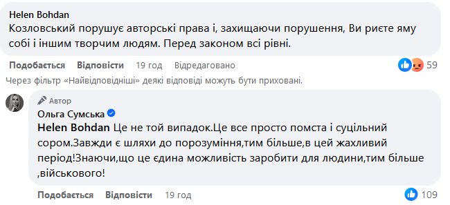 "Це не той випадок. Це все просто помста та суцільний сором. Завжди є шляхи до порозуміння, тим більше, в цей жахливий період! Знаючи, що це єдина можливість заробити для людини, тим більше військового!", - відповіла Сумська.