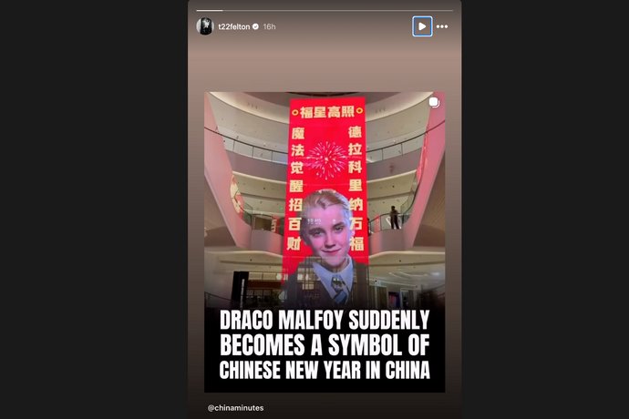 Схоже, Том Фелтон звернув увагу на ажіотаж довкола свого героя. Актор, якому зараз 38 років і який нещодавно знову зіграв Мелфоя у бродвейській постановці "Гаррі Поттер і прокляте дитя", поділився в Instagram фото з китайського торговельного центру.