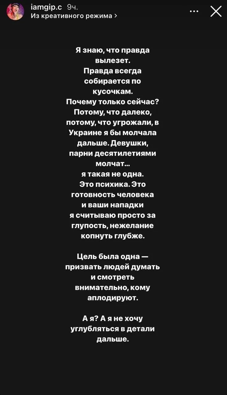 "Я знаю, що правда вилізе. Правда завжди збирається по шматочках. Чому тільки зараз? Тому що далеко, тому що погрожували, в Україні я б мовчала далі, - написала дівчина в Instagram-історіях. - Дівчата, хлопці десятиліттями мовчать. .. я не одна така".
