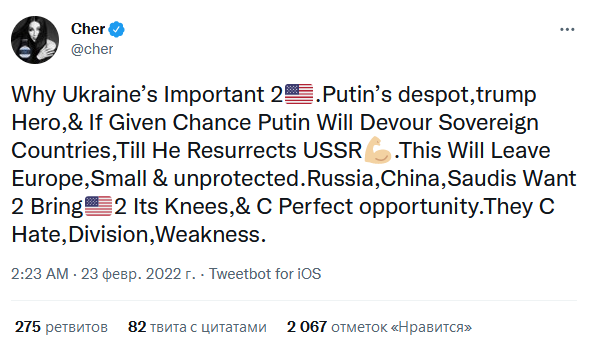 Знаменитість написала твіт, у якому підтримала український народ, а главу РФ назвала "деспотом". Шер заявила, що Путін має намір воскресити СРСР, Європу зробити маленькою, а США поставити на коліна.
