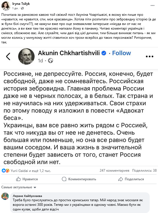 "Почитала за ранковою кавою той свіжий пост Акуніна Чхартішвілі, в якому він пише про "нравится, не нравится, спи, моя красавица". Хотіла піти розпитати про зебровидну історію (а де ж були білі смуги??), не кажучи вже про оце зневажливе імперське "нікуда ви от нас нє дєнєтєсь", а ви вже там так красиво напхали йому в панамку. Читаю коментарі українців і сміюся, обожнюю вас. Але слухайте, чим далі від цієї дичини, тим більше виникає питань - як ми могли колись у минулому житті ставитися хоч трохи всерйоз до таких персонажів? Риторичне, так", - йдеться у дописі.