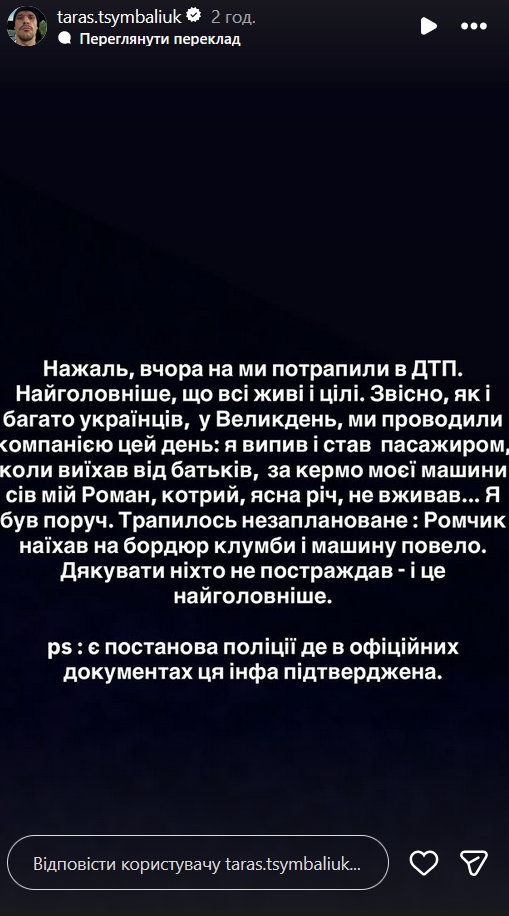 "На жаль, вчора ми потрапили в ДТП. Найголовніше, що всі живі і цілі. Звісно, як і багато українців, у Великдень ми проводили компанією цей день: я випив і став пасажиром, коли виїхали від батьків, за кермо моєї машини сів мій Роман, котрий, ясна річ, не вживав. Я був поруч. Трапилося незаплановане: Ромчик наїхав на бордюр клумби і машину повело. Дякувати, ніхто не постраждав - і це найголовніше", - зазначив Тарас.