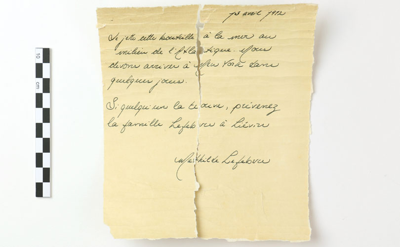 На сайті університету уточнюють, що запечатану пляшку знайшла сім'я відпочиваючих знайшла ще в 2017 році. У ній опинився лист від 13 квітні 1912 року, написаний Матільдою Лефевр. Фахівцям вдалося з'ясувати, що в квітні того року дівчинка з таким ім'ям піднімалася на борт "Титаніка".