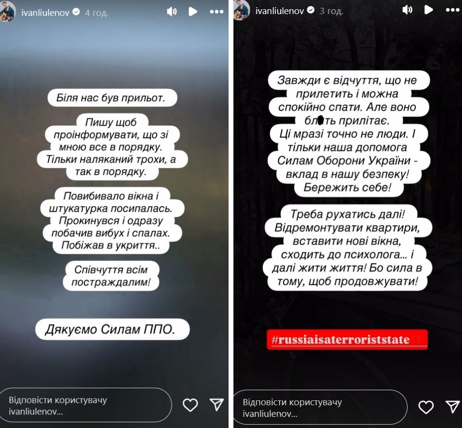 "Біля нас був прильот. Пишу, щоб проінформувати, що зі мною все в порядку. Тільки наляканий трохи, а так в порядку. Повибивало вікна і штукатурка посипалась. Прокинувся і одразу побачив вибух і спалах. Побіг в укриття", - розповів Іван.