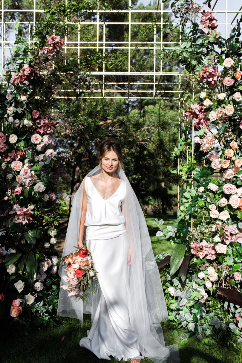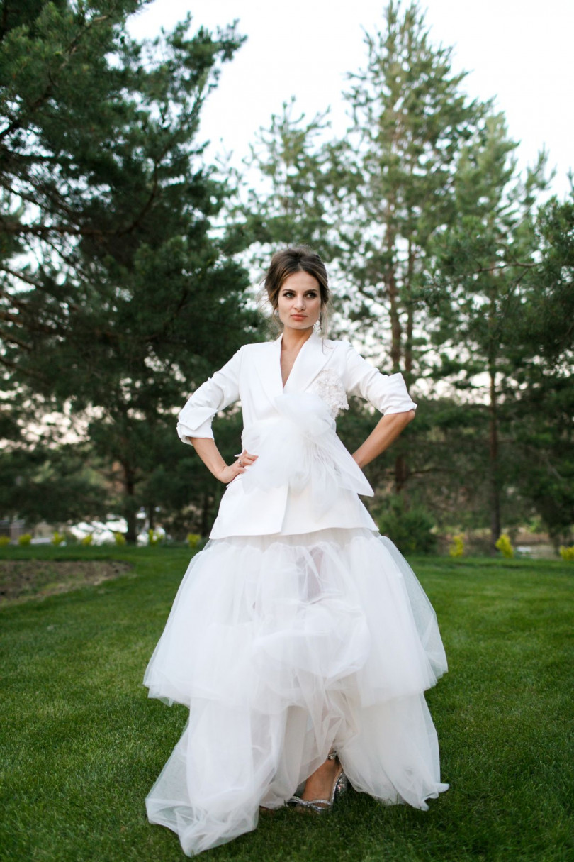 Селюкова змінила за вечір два вінчальні вбрання: для виїзної церемонії вона обрала довгу білу сукню в підлогу, яка вигідно підкреслила її фігуру, а пишну фатінову спідницю з піджаком вона одягла вже на вечірку.