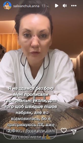 За словами акторки, їй приписали гормональні уколи, щоби швидше пройшла набряклість, проте вона від них відмовилася. Анна Саліванчук підтримує правильне харчування, скинула вже 2,5 кг та продовжує далі йти до своєї мети.