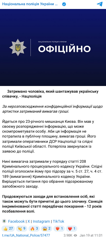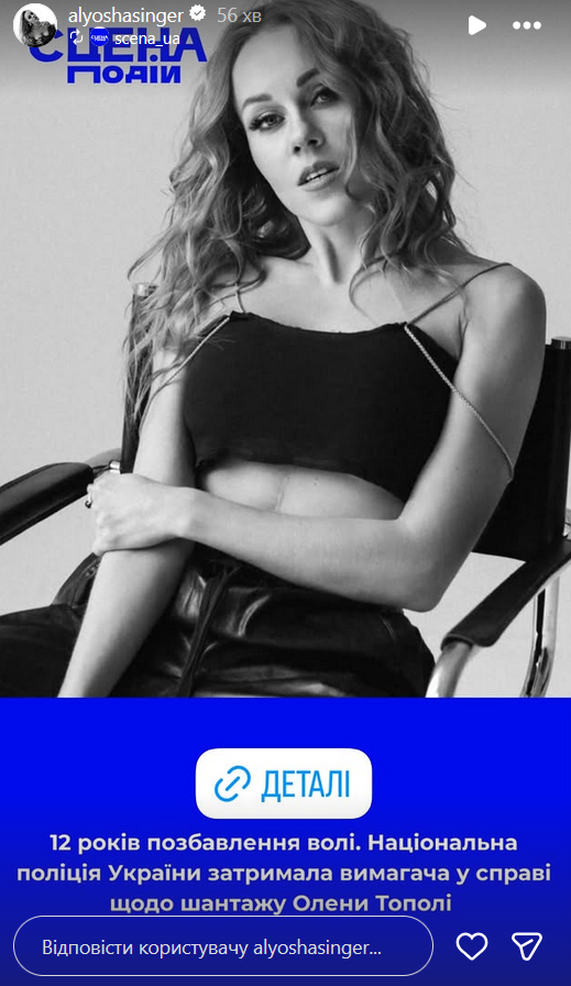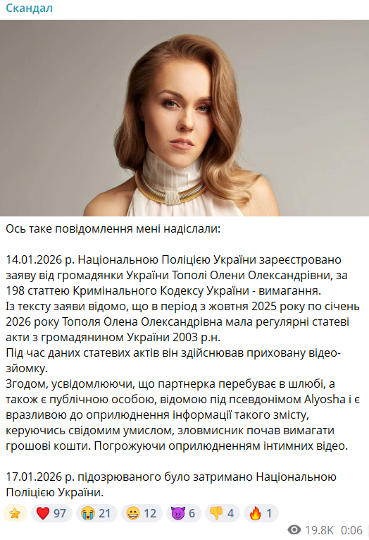 Раніше про затримання шантажиста Олени Тополі повідомляв Telegram-канал "Скандал". За їхніми даними підозрюваного було затримано ще 17 січня 2026 року, і він нібито був коханцем співачки. Сама артистка цю інформацію не коментує.