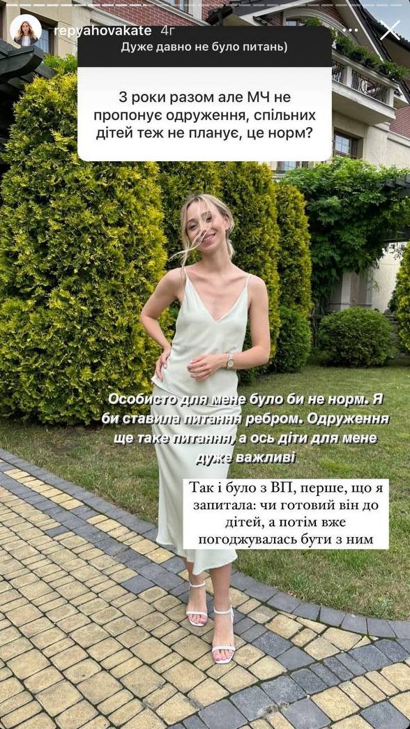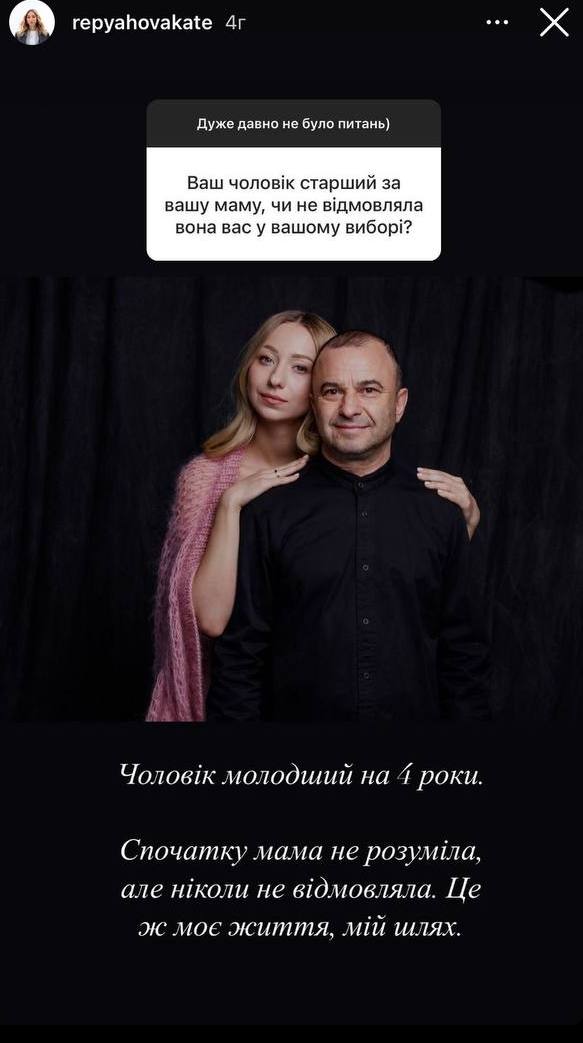 "Чоловік молодший [за маму] на 4 роки. Спочатку мама не розуміла, але ніколи не відмовляла. Це ж моє життя, мій шлях", - відповіла Репяхова на запитання підписниці, чи відмовляла її мама від стосунків зі співаком.