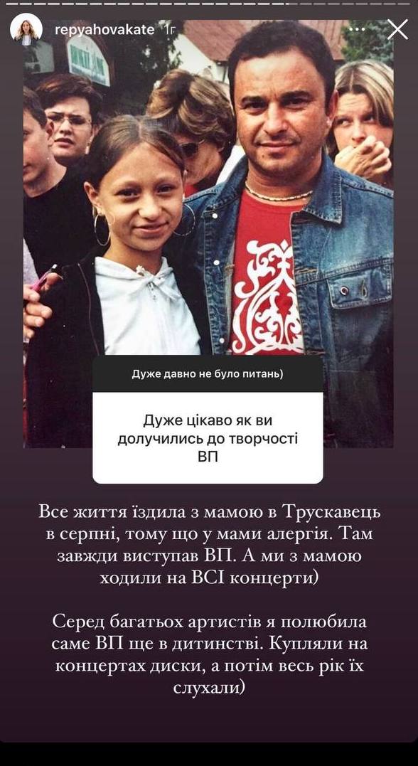 "Все життя їздила з мамою в Трускавець у серпні, тому що у мами алергія. Там завжди виступав Віктор Павлік. А ми з мамою ходили на всі концерти, - розповіла Репяхова. - Серед багатьох артистів я полюбила саме Віктора Павліка ще в дитинстві. Купували на концертах диски, а потім увесь рік їх слухали".