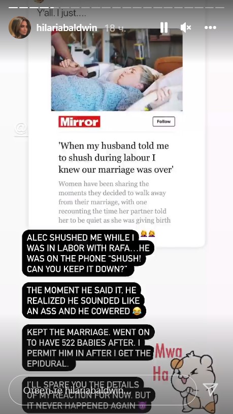 Коли ж Болдвін усвідомив, яким безглуздим було його прохання, за словами Хіларії, "він відчув себе дурнем і відразу зніяковів". Мама шістьох дітей після цієї комічної ситуації пожартувала, що змогла зберегти шлюб і "народила 522 дитини після…".