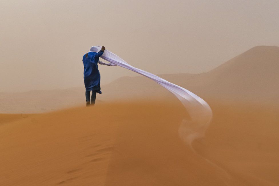 Друге місце в категорії "Люди і природа" зайняла фотографія піщаної бурі в Сахарі. На ній зображений гід по пустелі.
