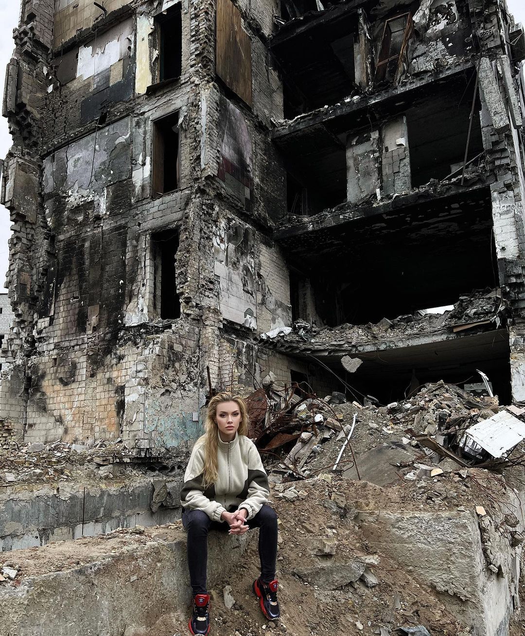 Представниця України на міжнародному конкурсі "Міс Всесвіт" опублікувала в Instagram фотографію, зроблену на "вулиці смерті" у Бородянці. У кадрі модель та волонтер сидить на тлі повністю зруйнованої російськими окупантами багатоповерхівки, повторюючи позу Олени Зеленської.