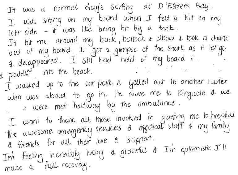 Опинившись в лікарні, потерпілий написав листа з подякою парамедикам і лікарям, які його врятували. Також він розповів все, що пам'ятає про напад морського хижака.