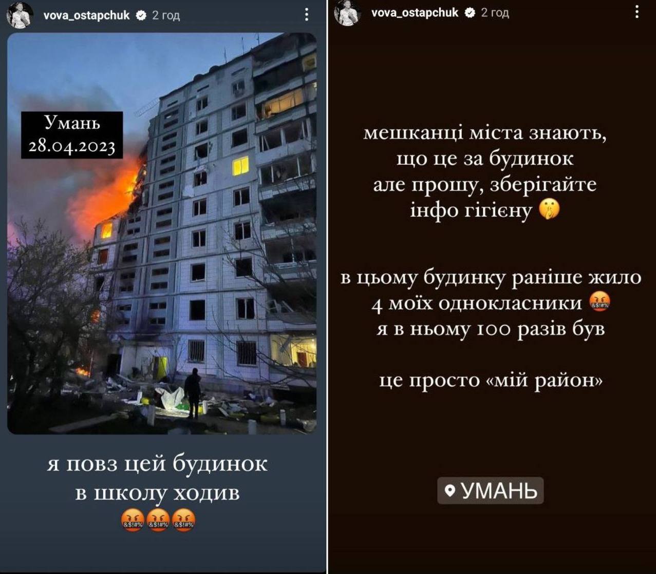 В Instagram-історіях шоумен опублікував моторошні кадри наслідків нічної атаки і розповів, що постраждалий будинок знаходиться в "його районі" і він був там багато разів. "Я повз цей будинок в школу ходив. Мешканці міста знають, що це за будинок, але прошу, зберігайте інфо гігієну. У цьому будинку раніше жило 4 моїх однокласників. Я в ньому 100 разів був. Це просто "мій район", - поділився Остапчук.