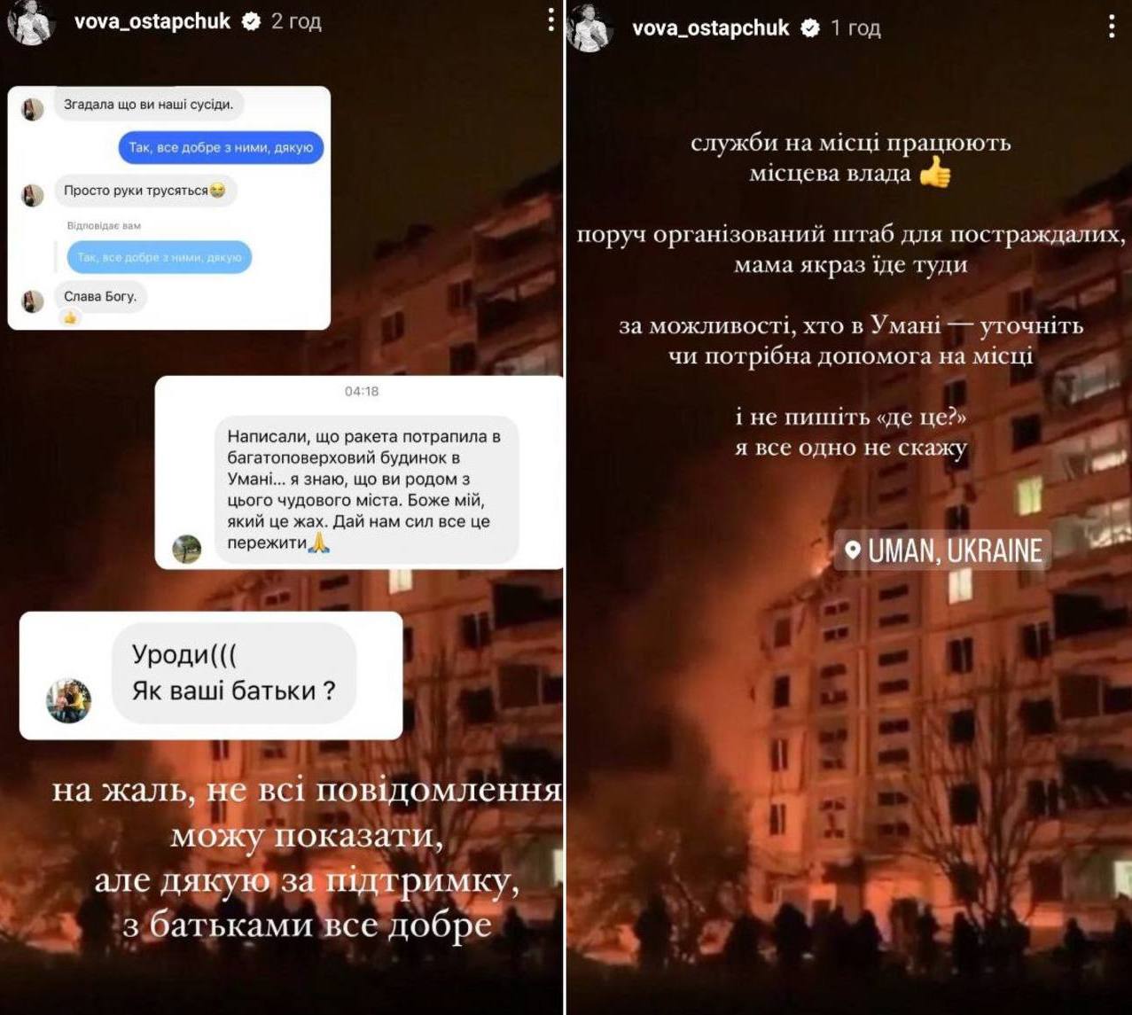 Остапчук додав, що його мама вирушила до штабу для постраждалих, який організувала місцева влада неподалік будинку. "По можливості, хто в Умані - уточніть, чи потрібна допомога на місці, - закликає ведучий. - І не пишіть "де це?". Я все одно не скажу".