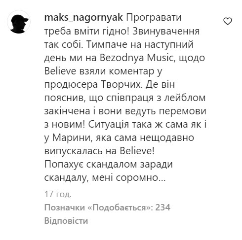"Програвати треба вміти гідно! Звинувачення так собі. Тим більше наступного дня ми на Bezodnya Music з приводу Believe взяли коментар у продюсера TVORCHI. Він пояснив, що співпраця з лейблом завершена, і вони ведуть переговори з новим. Ситуація така сама, як і у Марини, яка сама нещодавно випускалася на Believe. Попахує скандалом заради скандалу", - написав в Instagram музичний оглядач Макс Нагорняк.