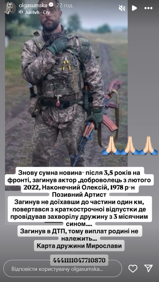 "Знову сумна новина: після 3,5 років на фронті загинув актор, доброволець з лютого 2022, Наконечний Олексій 1978 р.н., позивний Артист. Загинув, не доїхавши до частини один км, повертався з короткострокової відпустки, де відвідував хвору дружину з тримісячним сином. Загинув у ДТП, тож виплат сім'ї не належить", - повідомила Сумська.