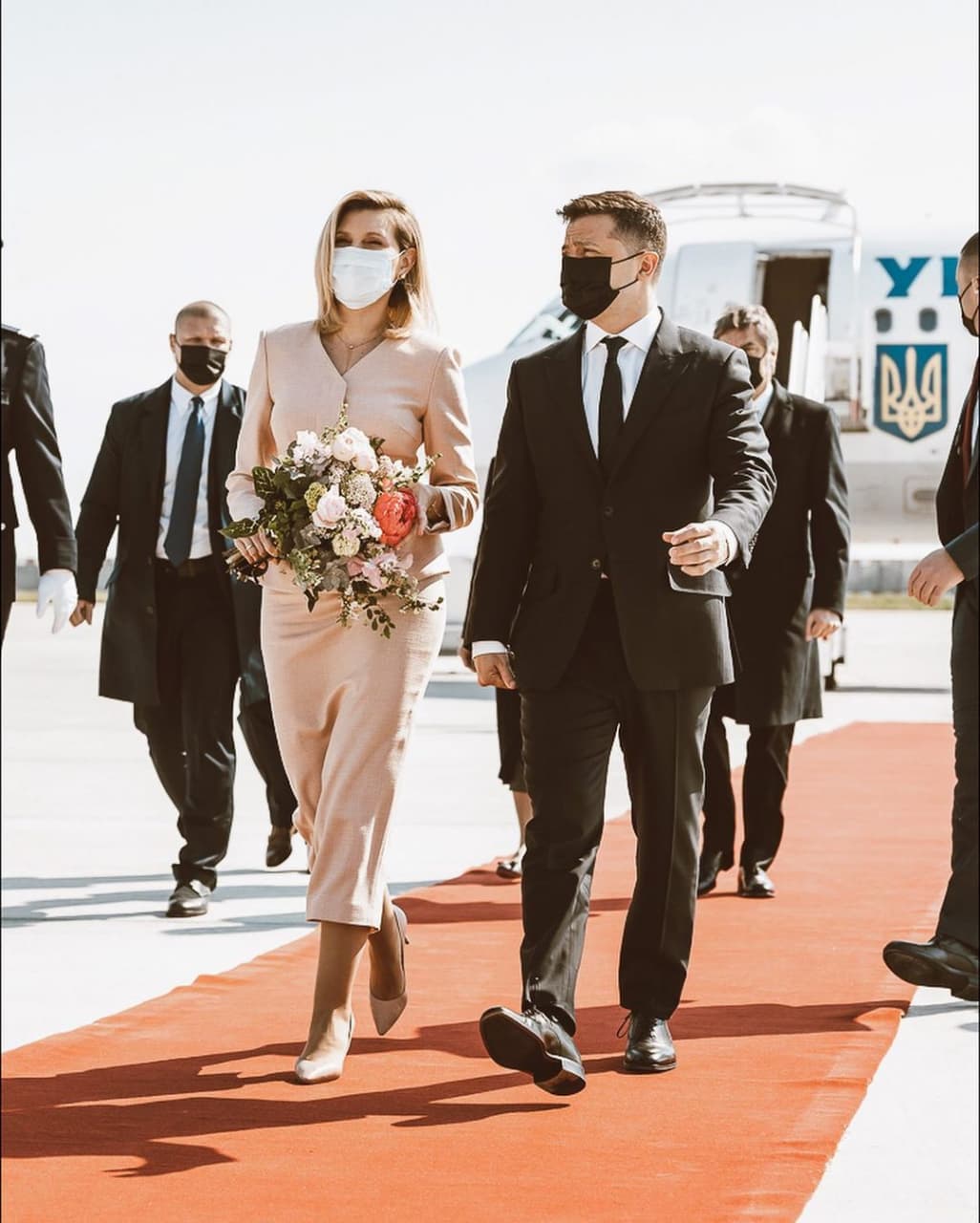 Для офіційного візиту гарант обрав строгий чорний костюм, а от Олена Зеленська надала перевагу елегантному піджаку зі спідницею бежевого кольору. Образ першої леді доповнив тонкий чорний пояс і туфлі в тон до вбрання.