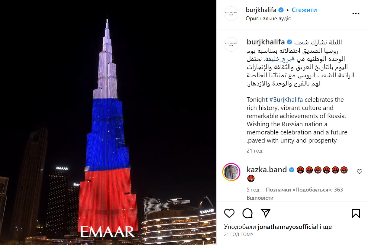 Найвищий хмарочос Дубая Бурдж Халіфа підсвітили кольорами російського прапора, щоб у такий спосіб привітати країну-терористку з днем РФ. Відповідне відео опублікували на сторінці споруди в Instagram, а сам ролик автори вирішили супроводити російським гімном.