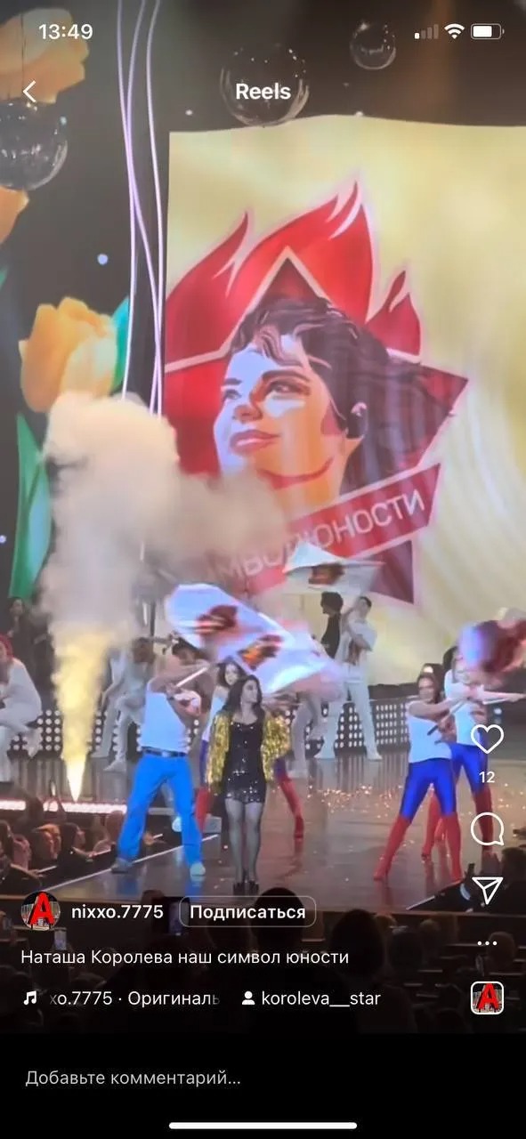 Окрім танцівниць у білих футболках, синіх лосинах та червоних чоботях, на сцені під час виступу також з'явилися прапори із червоною зіркою. У неї замість Леніна помістили портрет Корольової. Так співачка красномовно розписалася в любові до Росії та Радянського Союзу.