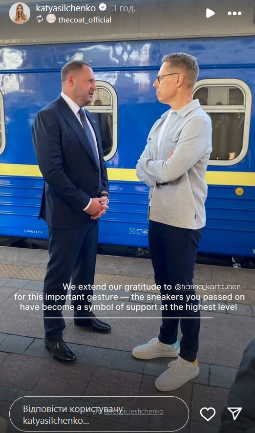 11 вересня з офіційним візитом до Києва прибув президент Фінляндії Александр Стубб. На вокзалі він з'явився у патріотичних кросівках українського бренду the COAT дизайнерки Каті Сільченко.