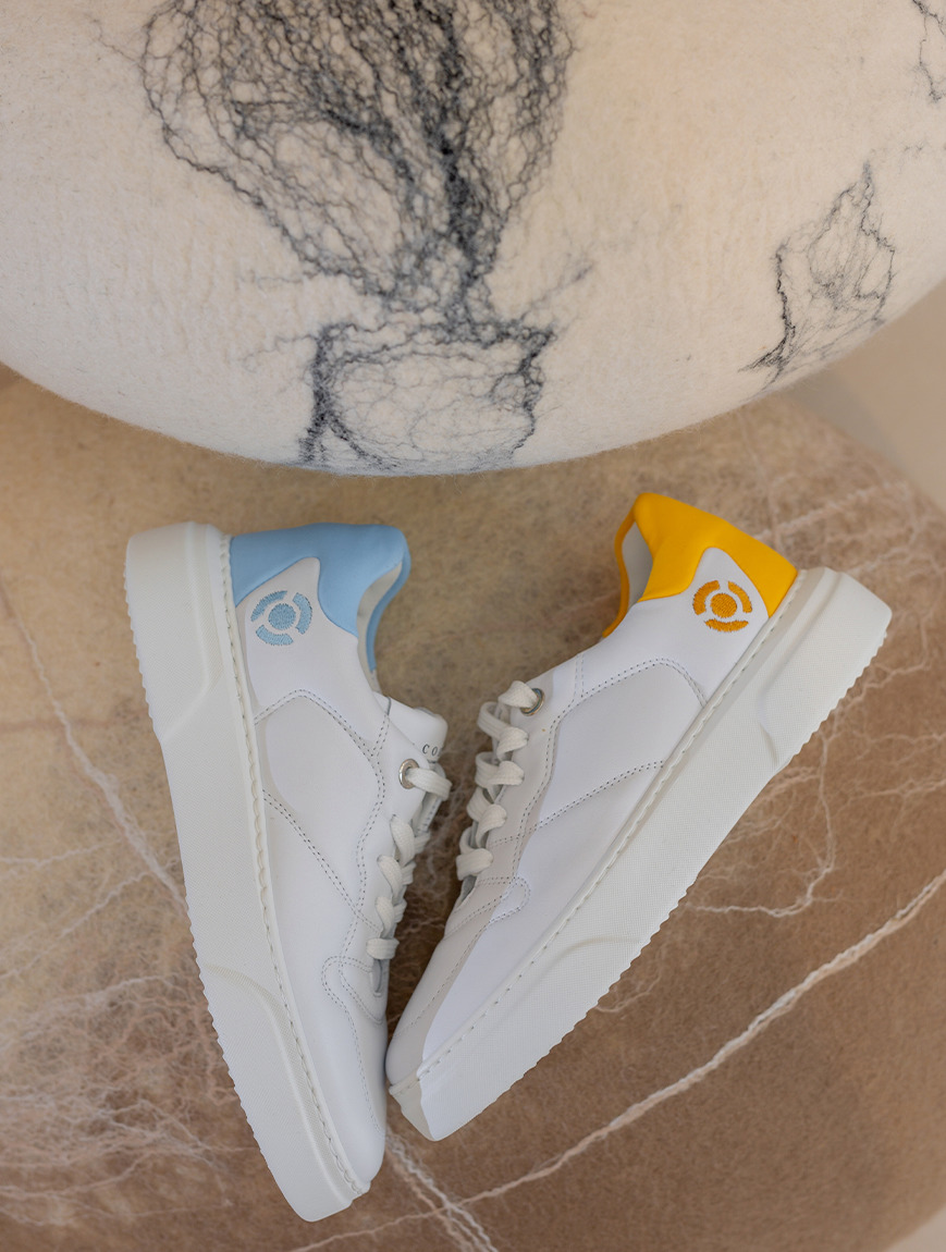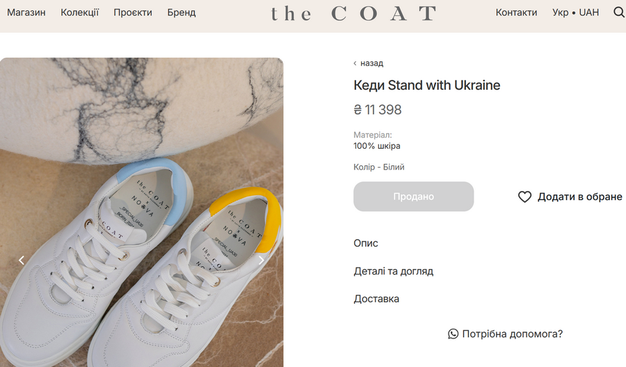 Ці кросівки з лімітованої колекції the COAT, яку український бренд створив спільно з італійськими колегами - брендом NOOVA. Вони мають назву - Stand with Ukraine. Мета лінійки - благодійна, виручені кошти від продажу взуття були спрямовані на допомогу жінкам та дітям, які постраждали від повномасштабного вторгнення РФ в Україну.