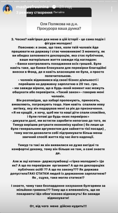 Розповісти про це Єфросиніна вирішила на тлі скандалу з Олею Поляковою. Нагадаємо, нещодавно артистка виступила на елітному весіллі у Львові експрокурора Ростислава Ільницького та колишньої співробітниці Держбюро розслідувань Роксолани Москви. На запитання підписників про те, що Марія думає про ситуацію, що склалася, вона зазначила, що "її нудить від огидного хизування пишними святкуваннями" за мільйони гривень у період повномасштабної війни.