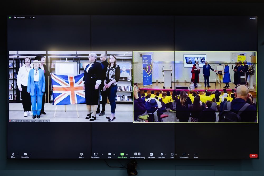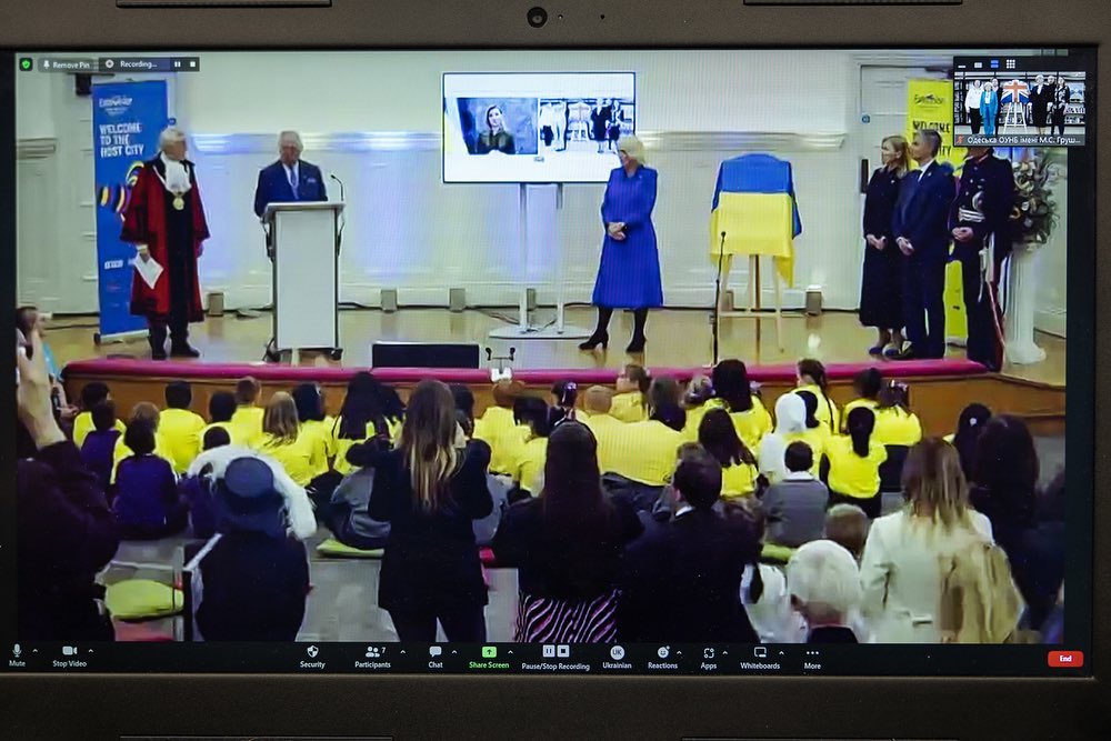 Після відкриття сцени "Євробачення-2023" у Ліверпулі король Чарльз та королева-консорт Камілла взяли участь у церемонії проголошення побратимства між бібліотеками України та Великої Британії. До заходу за допомогою відеозв'язку долучилася Олена Зеленська.