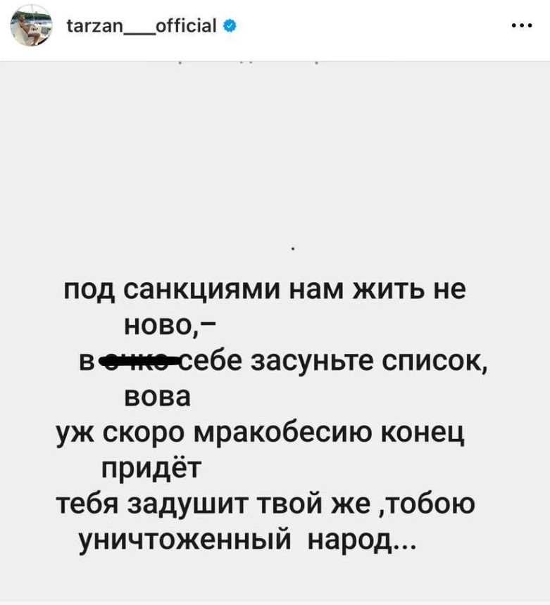 У своєму зверненні путініст також назвав українців "приниженим народом", який нібито захоче "задушити президента. "Под санкциями нам жить не ново, в очк* себе засуньте список, Вова. Уж скоро мракобесию конец придет, тебя задушит твой же, тобою уничтоженный народ", – написав росіянин на своїй сторінці в Instagram.