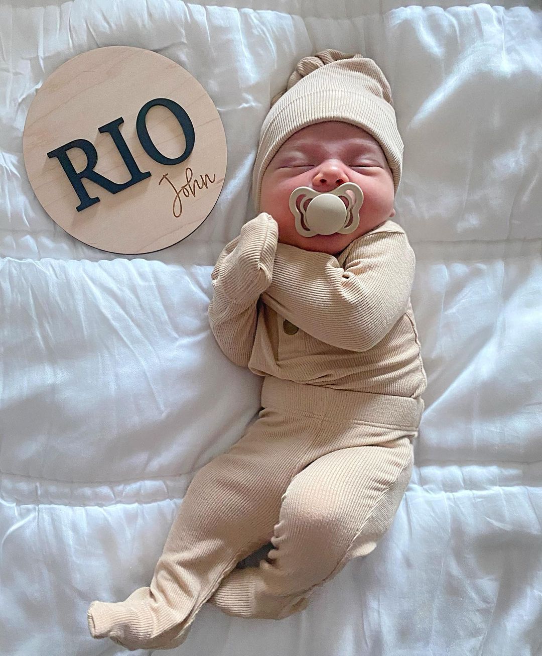 Пара опублікувала в Instagram спільний допис, в якому розповіла, як вони назвали малюка. Також батьки показали офіційну фотографію, де хлопчика повністю видно. На знімку маля у бежевому костюмчику солодко спить, а поруч лежить табличка з його ім'ям – Ріо Джон.