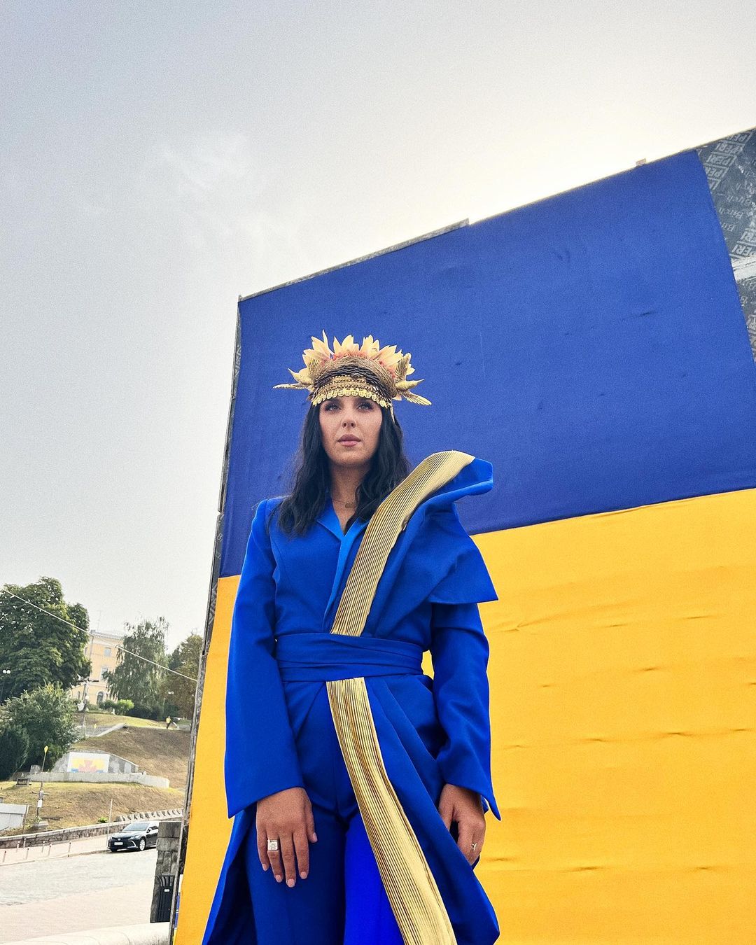 Джамала у День Незалежності виступила у київському метро. Для святкового концерту співачка обрала дизайнерський синьо-жовтий брючний костюм та фантазійний головний убір, прикрашений пелюстками соняшника, колоссями та фігурками журавлів.