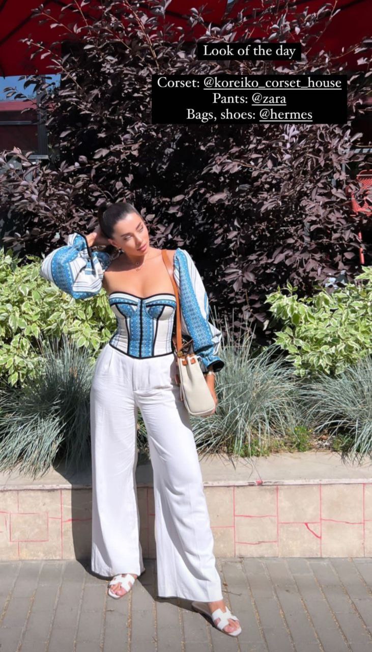 Модель Анна Неплях, яка представляла Україну на конкурсі "Міс Всесвіт-2021", 24 серпня одягнулася у спокусливий вишитий корсет із пишними рукавами. Образ вона доповнила широкими білими штанами, білими босоніжками та мінімалістичними золотими підвісками.