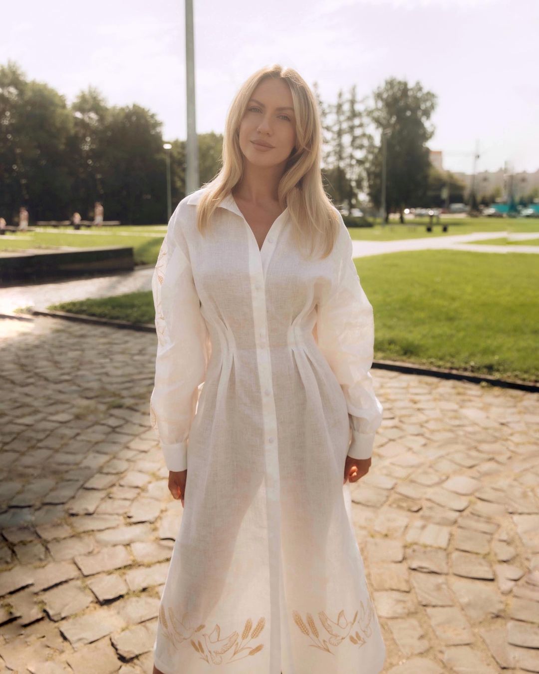 Святковим вбранням Лесі Нікітюк стала біла сукня на ґудзиках, прикрашена золотистою вишивкою у вигляді колосків та птахів. Вбрання з тонкого льону в сонячному світлі виглядало напівпрозорим і дуже ніжним.