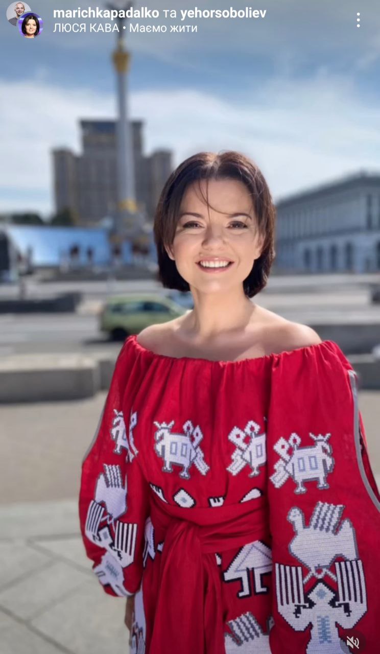 Телеведуча Марічка Падалко на честь свята вбралася у червону сукню-вишиванку зі спущеними плечима та широким поясом. Вбрання прикрасила біло-сіра вишивка у вигляді тварин та птахів.