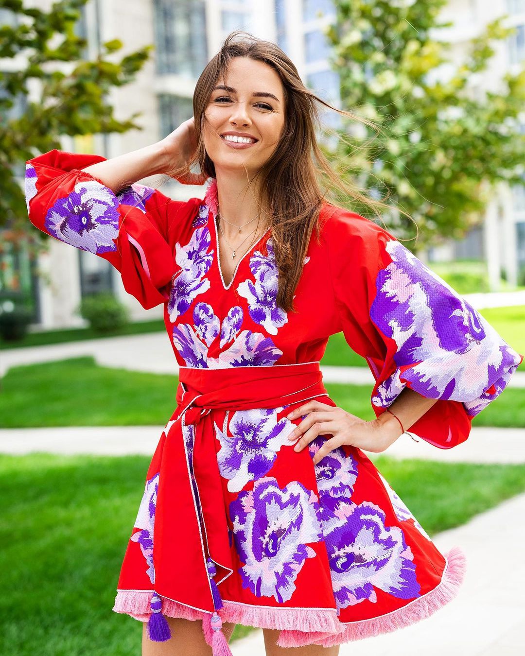 Яскраве вбрання у День Незалежності обрала Христина Решетник – дружина телеведучого Григорія Решетника. Мама трьох синів виглядала бездоганно в короткій червоній сукні з вишитими фіолетовими квітами та широкими рукавами. Поділ сукні прикрасила пухнаста рожева бахрома.