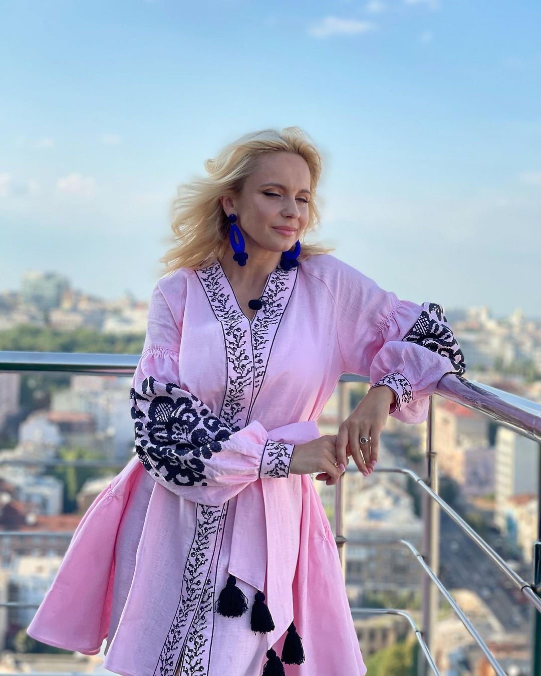 Лілія Ребрик зачарувала образом у короткій рожевій сукні з чорною вишивкою. Вбрання актриса та телеведуча доповнила яскравим аксесуаром - фіолетовими великими сережками в етно-стилі.