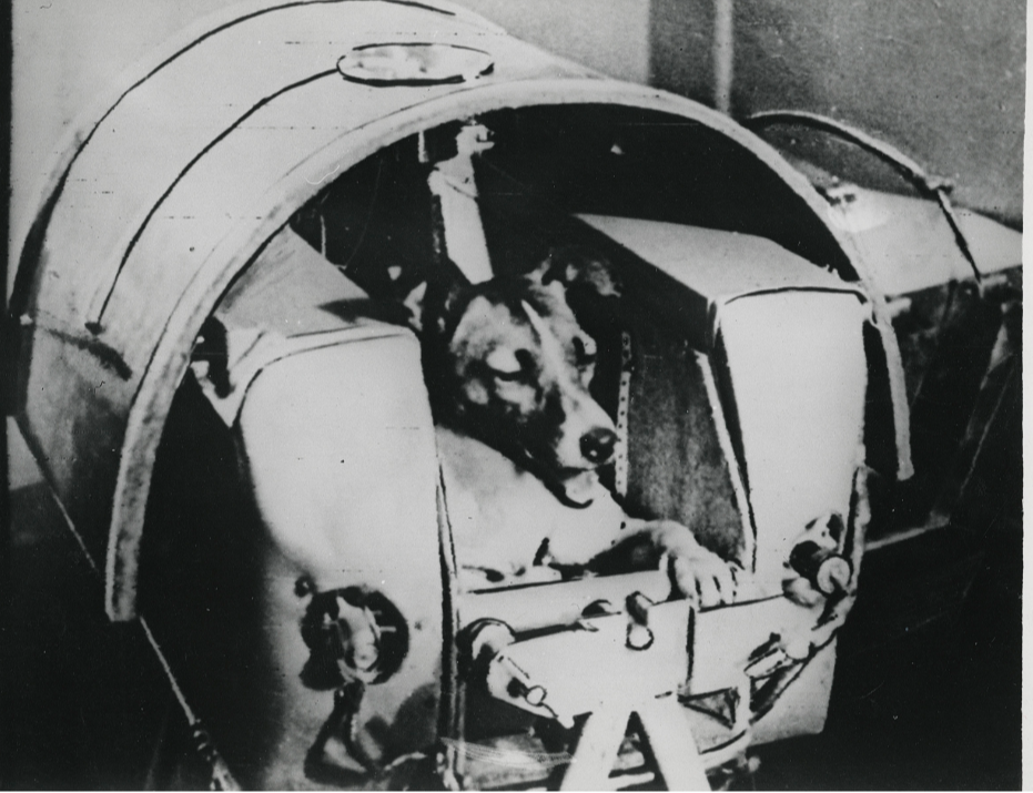 Собака Лайка, перша тварина, що побувала на орбіті Землі, перед запуском, 3 листопада 1957 року.
