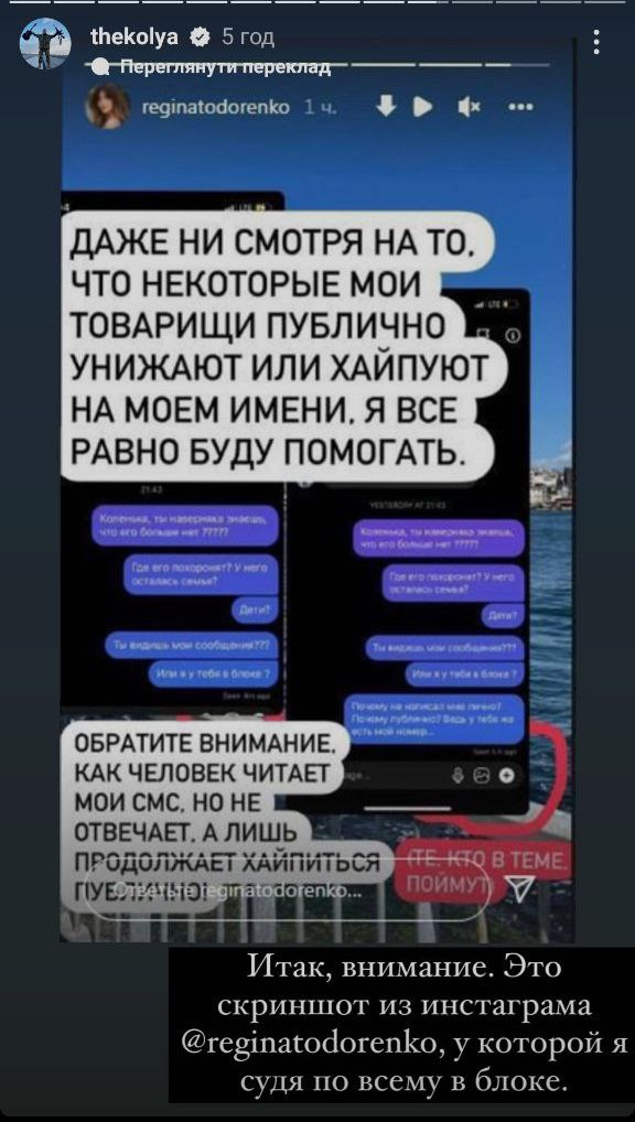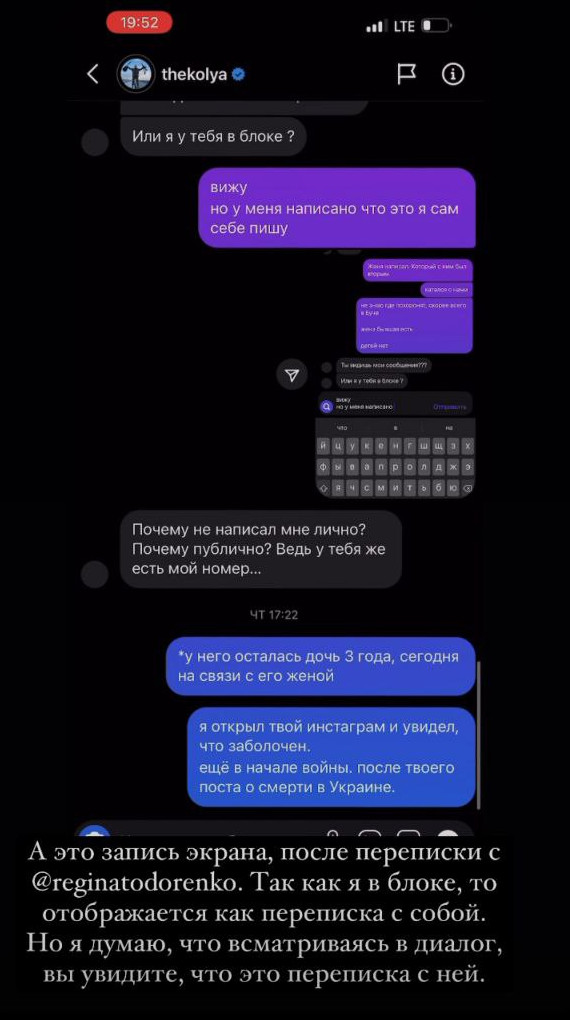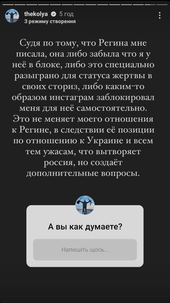 "Судячи з того, що Регіна мені писала, вона або забула, що я в неї в блоці, або це спеціально розіграно для статусу жертви у своїх сторіз, або якимось чином інстаграм заблокував мене для неї самостійно, - припустив Серга. - Це не змінює мого ставлення до Регіни внаслідок її позиції стосовно України та всіх тих жахів, що витворює росія, але створює додаткові питання".