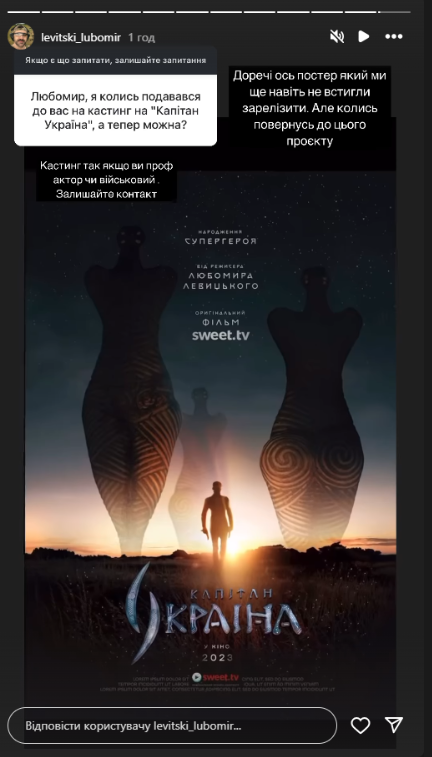 Варто зауважити, що "Капітан Україна" - це проєкт фільму Любомира Левицького, зйомки якого мали розпочатися напочатку 2022 року. Однак у 2022 році проєкт поставили на паузу через повномасштабне вторгнення РФ в Україну.