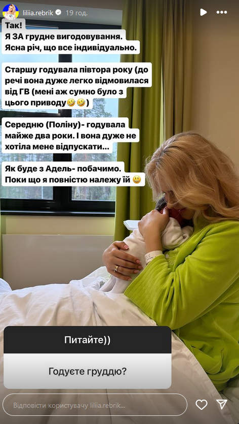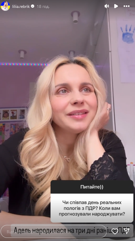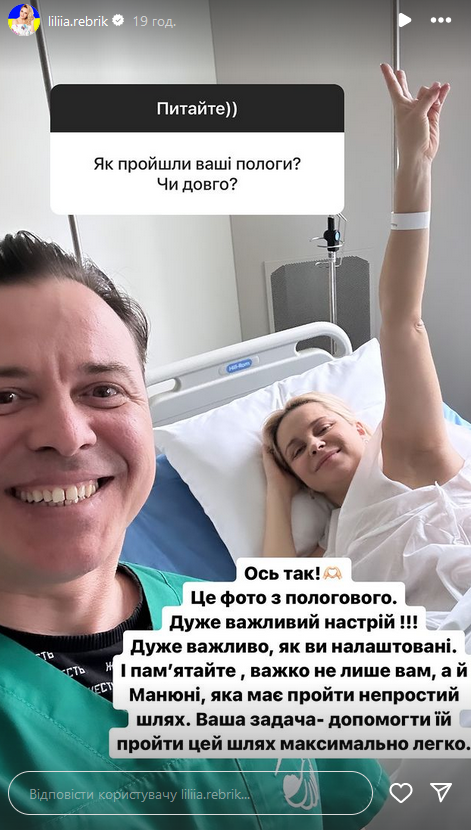 В Instagram-"історіях" багатодітна мама зізналася, що народила на 39-му тижні, на три дні раніше передбачуваної дати пологів. Лілія поділилася, що того дня приїхала просто на плановий огляд, а народжувати вона планувала у понеділок, 18 березня.