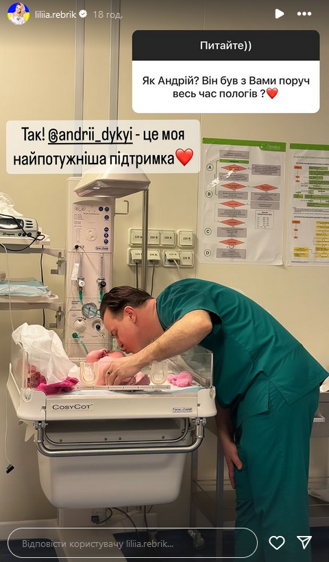 У телеведучої були партнерські пологи. Хореограф Андрій Дикий був із дружиною весь період і разом із нею побачив крихітку в перші хвилини її життя. Ребрик називає коханого "найпотужнішою підтримкою".