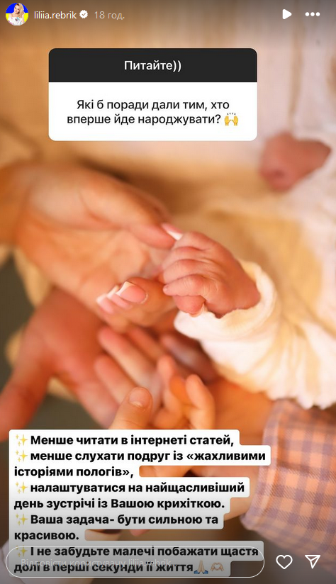 Ребрик додала, що пологи були природніми, пройшли у позитивній атмосфері та з правильним настроєм. "Дуже важливий настрій, - каже акторка. - Дуже важливо, як ви налаштовані. І пам'ятайте, важко не лише вам, а й манюні, яка має пройти непростий шлях. Ваша задача - допомогти їй пройти цей шлях максимально легко".