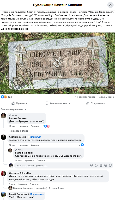 "Питання на подумати. Десятки підрозділів нашого війська названі на честь "Чорних Запорожців", "Лицарів Зимового походу", "Холодного Яру", Болбочана, Коновальця, Дашкевича, Алмазова тощо, молодь вчиться у ліцеях імені Героїв Крут, то може було б доцільно подумати над тим, щоб повернути історичні національні назви військових звань?", - запитав історик у підписників.